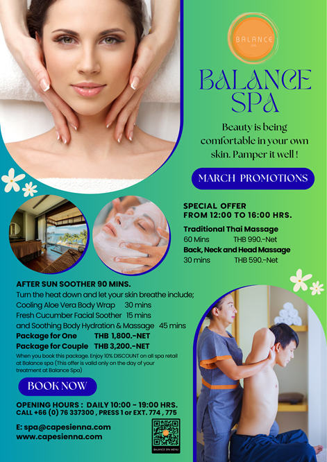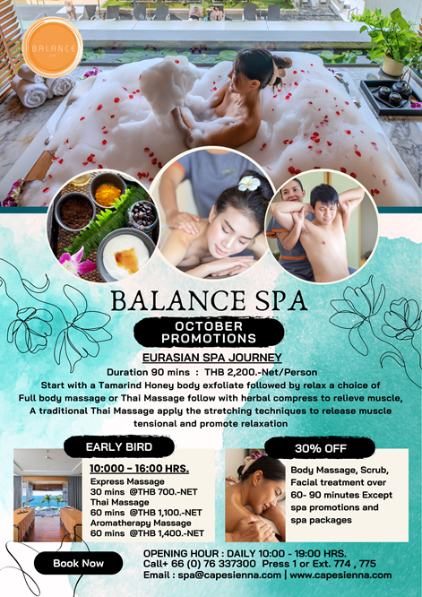Balance Spa at the Cape Sienna Phuket Gourmet Hotel & Villas welcomes you to a journey of mind, body and spirit. Rediscover yourself in the beautiful spa chambers overlooking the blue ocean and surrounded by delicate fragrances. Our specially designed treatments blend ancient physical and spiritual healing concepts using natural local ingredients and experienced hands which will leave you deeply relaxed, nourished and rejuvenated. Try the Sienna Indulgence to slip away in tranquility for a period of time and wake up to a completely rejuvenated you.